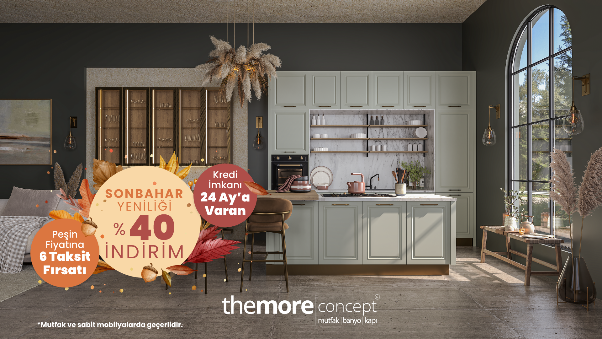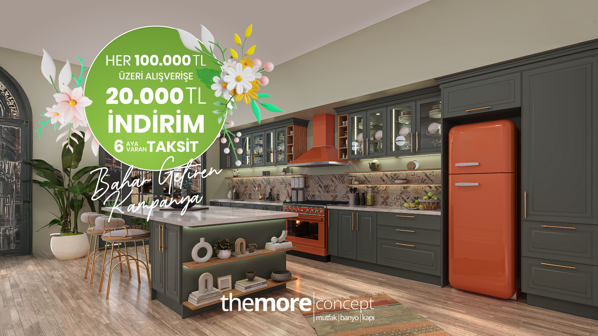 Tek çatı altında tüm sabit mobilya üretimi yapan Themore Concept olarak; mutfak, banyo, kapı, vestiyer, dolap, ray dolap ve tüm dekorasyon ürünlerinde geçerli kampanyamız ile evinizi yeniliyoruz.
